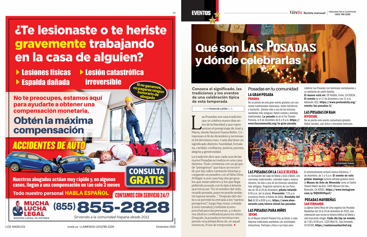 SAN FERNANDO La iglesia Santa Rosa de Lima organiza las Posadas Navideñas del 16 al 24 de diciembre de 2025, una celebración que recrea la historia bíblica de María y José buscando refugio. Cada día hay un evento, de 7:30 a 9:30 p. m. 1325 Mott St., San Fernando, CA 91340. https:// santarosachurchsf. org