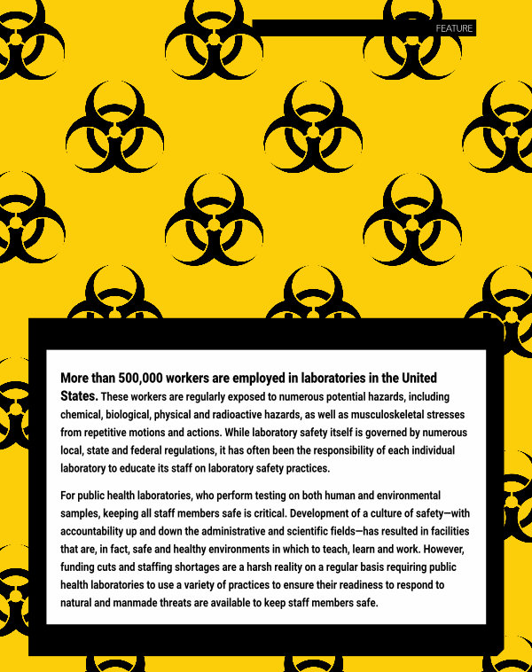 accountability up and down the administrative and scientific fields— has resulted in facilities that are, in fact, safe and healthy environments in which to teach, learn and work. However, funding cuts and staffing shortages are a harsh reality on a regular basis requiring public health laboratories to use a variety of practices to ensure their readiness to respond to natural and manmade threats are available to keep staff members safe.
