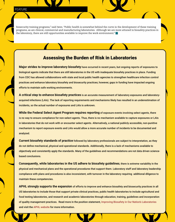 APHL strongly supports the expansion of efforts to improve and enhance biosafety and biosecurity practices in all US laboratories to include those that support private clinical practices, public health laboratories to include agricultural and food testing laboratories, and research and academic laboratories through education, training, guidelines and incorporation of quality management practices. Read more in the position statement, Improving Biosafety in Our Nation’ s Laboratories and visit the APHL website for more information.