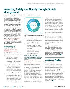 Having an international standard that blends both quality and safety is imperative to support all laboratory operations. APHL is eager to continue to collaborate with these pilots to implement this standard and promote the value of ISO 35001 with other public health laboratories in the future. g