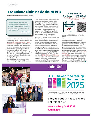 across the country, the community offers space for real-time discussions about challenges, results and best practices at the enteric bench. Members work in laboratories of all sizes and capacities, but all share a commitment to accurate testing and a unified public health response. One of the primary goals of the NERLC is to empower public health laboratories to speak up and share experiences and help guide future priorities. It’ s not just about updates; it’ s about building a peer-led environment where laboratories can learn from one another and shape the conversation together. There are scheduled calls that discuss current outbreaks, interesting findings and updates to best practices. So far, the NERLC has hosted speakers from public health laboratories on topics such as Shiga toxin-producing E. coli( STEC) and Enteroinvasive E. coli( EIEC), as well as review of STEC, Shigella and Salmonella workflow documents aimed at improving efficiency and saving costs in public health laboratories. The community also keeps members up to date on the latest