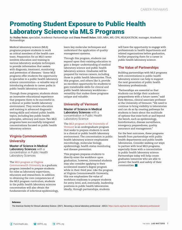 Building partnerships with MLS programs with concentrations in public health laboratory science can help to support the next generation of public health laboratory professionals.