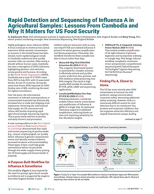 Over the years, the international movement of infected animal products or contaminated materials has dramatically increased due to trade and shipping route expansions. Protecting the international food supply, for US consumers and others, will involve improving rapid agricultural sample sequencing capacity. This is particularly relevant to poultry and dairy farmers and processors. inhibitor-tolerant extraction with an easy, one-step RT-PCR and indexed influenza A primers for whole-genome amplification and library preparation. Ultimately, this workflow transforms these samples into data in hours rather than days.