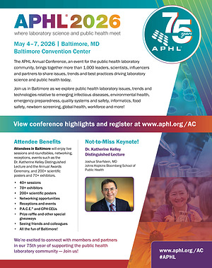 Join us in Baltimore as we explore public health laboratory issues, trends and technologies relative to emerging infectious diseases, environmental health, emergency preparedness, quality systems and safety, informatics, food safety, newborn screening, global health, workforce and more!