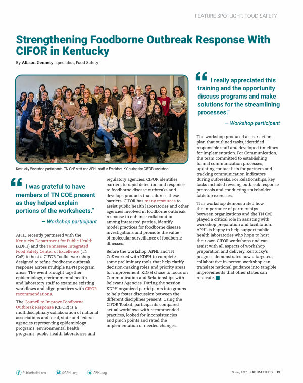 APHL recently partnered with the Kentucky Department for Public Health( KDPH) and the Tennessee Integrated Food Safety Center of Excellence( TN CoE) to host a CIFOR Toolkit workshop designed to refine foodborne outbreak response across multiple KDPH program areas. The event brought together epidemiology, environmental health and laboratory staff to examine existing workflows and align practices with CIFOR recommendations.