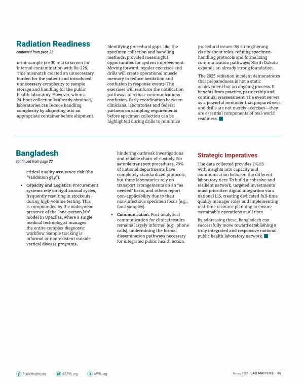 Identifying procedural gaps, like the specimen collection and handling methods, provided meaningful opportunities for system improvement. Moving forward, regular exercises and drills will create operational muscle memory to reduce hesitation and confusion in response events. The exercises will reinforce the notification pathways to reduce communications confusion. Early coordination between clinicians, laboratories and federal partners on sampling requirements before specimen collection can be highlighted during drills to minimize procedural issues. By strengthening clarity about roles, refining specimenhandling protocols and formalizing communication pathways, North Dakota expands an already strong foundation.