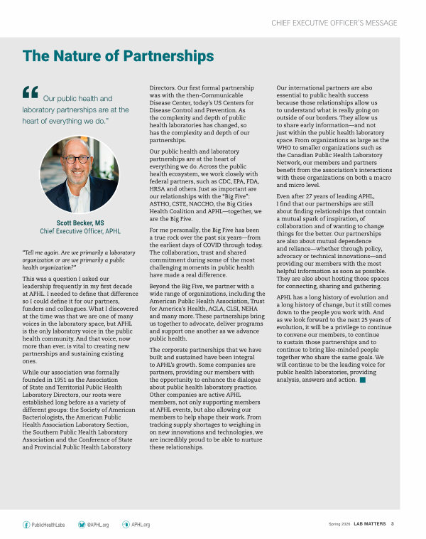 APHL has a long history of evolution and a long history of change, but it still comes down to the people you work with. And as we look forward to the next 25 years of evolution, it will be a privilege to continue to convene our members, to continue to sustain those partnerships and to continue to bring like-minded people together who share the same goals. We will continue to be the leading voice for public health laboratories, providing analysis, answers and action. g