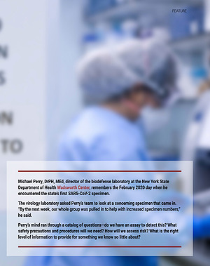 Michael Perry, DrPH, MEd, director of the biodefense laboratory at the New York State Department of Health Wadsworth Center, remembers the February 2020 day when he encountered the state’ s first SARS-CoV-2 specimen.