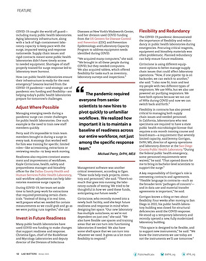 How can public health laboratories ensure their infrastructure is ready for the next emergency? Lessons learned from the COVID-19 pandemic— and strategic use of pandemic-era funding and flexibility— are helping today’ s public health laboratories prepare for tomorrow’ s challenges.