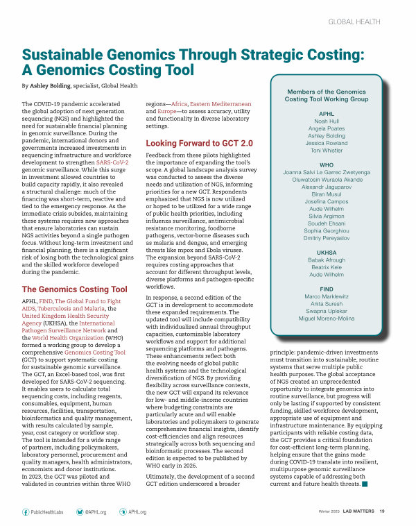APHL, FIND, The Global Fund to Fight AIDS, Tuberculosis and Malaria, the United Kingdom Health Security Agency( UKHSA), the International Pathogen Surveillance Network and the World Health Organization( WHO) formed a working group to develop a comprehensive Genomics Costing Tool( GCT) to support systematic costing for sustainable genomic surveillance. The GCT, an Excel-based tool, was first developed for SARS-CoV-2 sequencing. It enables users to calculate total sequencing costs, including reagents, consumables, equipment, human resources, facilities, transportation, bioinformatics and quality management, with results calculated by sample, year, cost category or workflow step. The tool is intended for a wide range of partners, including policymakers, laboratory personnel, procurement and quality managers, health administrators, economists and donor institutions. In 2023, the GCT was piloted and validated in countries within three WHO regions— Africa, Eastern Mediterranean and Europe— to assess accuracy, utility and functionality in diverse laboratory settings.