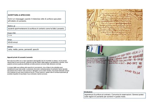 esperienza di scrittura al contrario . Comunica le osservazioni . Genera ipotesi sulle ragioni di Leonardo per scrivere in questo modo .