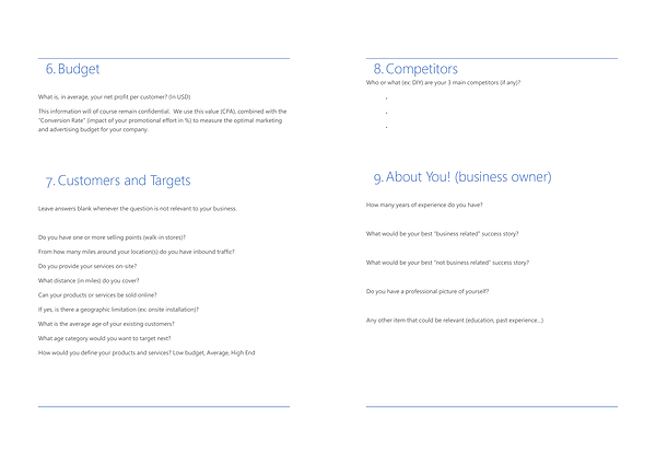 Do you have one or more selling points (walk-in stores)? From how many miles around your location(s) do you have inbound traffic? Do you provide your services on-site? What distance (in miles) do you cover? Can your products or services be sold online? If yes, is there a geographic limitation (ex: onsite installation)? What is the average age of your existing customers? What age category would you want to target next? How would you define your products and services? Low budget, Average, High End