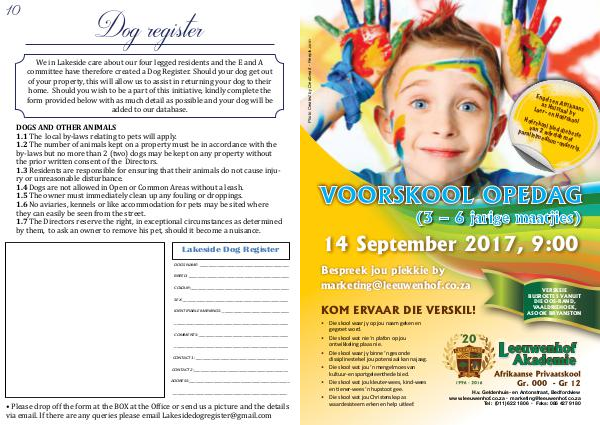 10 Dog register We in Lakeside care about our four legged residents and the E and A committee have therefore created a Dog Register. Should your dog get out of your property, this will allow us to assist in returning your dog to their home. Should you wish to be a part of this initiative, kindly complete the form provided below with as much detail as possible and your dog will be added to our database. DOGS AND OTHER ANIMALS 1.1 The local by-laws relating to pets will apply. 1.2 The number of animals kept on a property must be in accordance with the by-laws but no more than 2 (two) dogs may be kept on any property without the prior written consent of the Directors. 1.3 Residents are responsible for ensuring that their animals do not cause inju- ry or unreasonable disturbance. 1.4 Dogs are not allowed in Open or Common Areas without a leash. 1.5 The owner must immediately clean up any fouling or droppings. 1.6 No aviaries, kennels or like accommodation for pets may be sited where they can easily be seen from the street. 1.7 The Directors reserve the right, in exceptional circumstances as determined by them, to ask an owner to remove his pet, should it become a nuisance. Lakeside Dog Register DOGS NAME: ________________________________________ BREED: _____________________________________________ COLOUR:____________________________________________ SEX: _______________________________________________ IDENTIFIABLE MARKINGS: ______________________________ ___________________________________________________ COMMENTS: ________________________________________ ___________________________________________________ ______________________________ CONTACT 1: _________________________________________ CONTACT 2:__________________________________________ ADDRESS:_____________________________________________ ___________________________________________________ • Please drop off the form at the BOX at the Office or send us a picture and the details