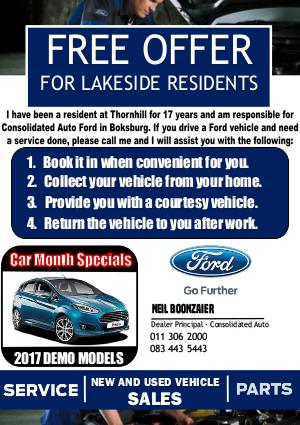 FREE OFFER FOR LAKESIDE RESIDENTS 1. 2. 3. 4. Book it in when convenient for you. Collect your vehicle from your home. Provide you with a courtesy vehicle. Return the vehicle to you after work. Monthly Specials Neil Boonzaier Dealer Principal - Consolidated Auto 2017 DEMO MODELS 011 306 2000 083 443 5443 NEW AND USED VEHICLE SALES