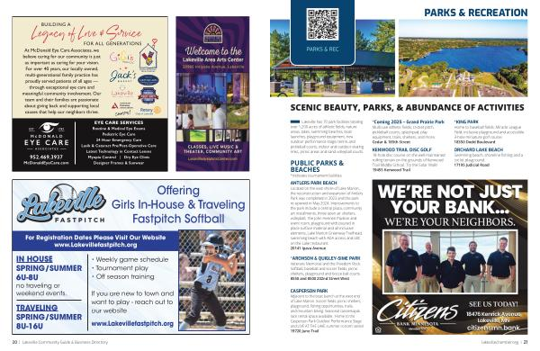 CASPERSON PARK Adjacent to the boat launch at the west end of Lake Marion. Soccer fields, picnic shelters, playground, fishing opportunities, trails, and mountain biking. Seasonal canoe / kayak rack rental space available. Home to the Casperson Park Outdoor Performance Stage and LIVE AT THE LAKE summer concert series! 19720 Juno Trail lakevillechamber. org | 21