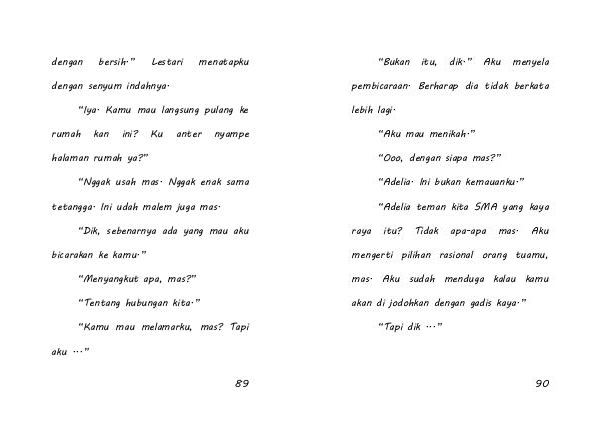 “ Dik, sebenarnya ada yang mau aku bicarakan ke kamu.”“ Menyangkut apa, mas?”“ Tentang hubungan kita.”“ Kamu mau melamarku, mas? Tapi aku...”