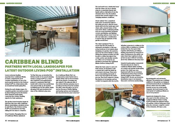 Luxury external shading manufacturer , Caribbean Blinds , recently completed its most ‘ creative ’ installation of one of its most popular products , the Outdoor Living Pod™ , in collaboration with an exceptional landscaping firm .