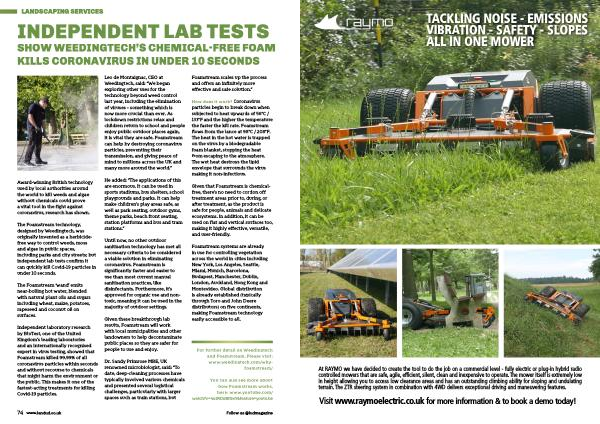 Leo de Montaignac , CEO at Weedingtech , said : “ We began exploring other uses for the technology beyond weed control last year , including the elimination of viruses – something which is now more crucial than ever . As lockdown restrictions relax and children return to school and people enjoy public outdoor places again , it is vital they are safe . Foamstream can help by destroying coronavirus particles , preventing their transmission , and giving peace of mind to millions across the UK and many more around the world .”