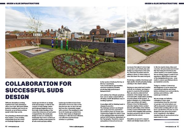 Landscape Architects as design work and strategy co-exist in the context of SuDS design . Water and Drainage Engineers have a thorough understanding of the connection between soil and water . Comparatively , the Landscape design focuses on creating key landmarks that look to achieve an aesthetic healthy environment for all who work and play within .