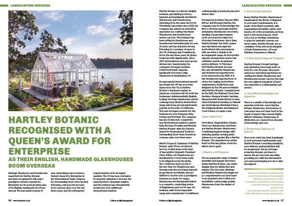 Its exponential international growth has meant the UK has now been replaced by the US as Hartley Botanic ’ s dominant market , as American customers fall for both the businesses ’ quintessentially Englishlooking Victorian Glasshouses and its contemporary Modern Horticulture range which has proved particularly popular in the state of California . The next strongest markets for the business are now Germany , Italy , Ireland and Portugal . The company has also broken into completely new international markets , namely Italy , Norway , Slovakia and Estonia . Hartley Botanic wins the Queen ’ s Award for International Trade for Outstanding Short Term Growth in overseas sales over three years .
