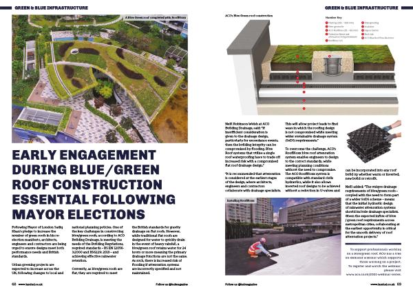 Urban greening projects are expected to increase across the UK , following changes to local and national planning policies . One of the key challenges in constructing blue / green roofs , according to ACO Building Drainage , is meeting the needs of the Building Regulations , required standards – BS EN 12056- 3:2000 and BS6229 : 2018 – and achieving effective rainwater retention .