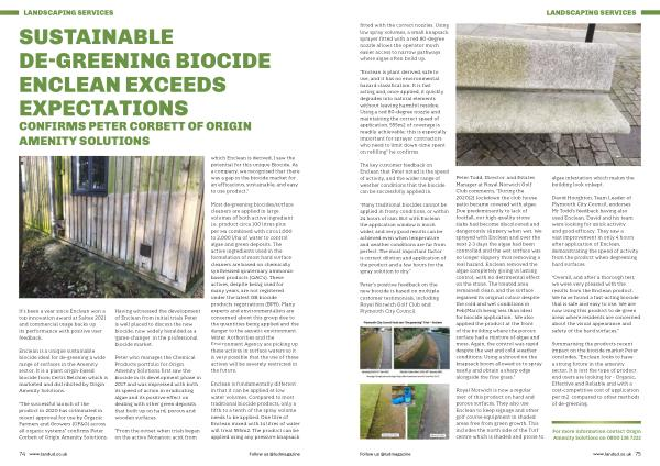 Enclean is a unique sustainable biocide ideal for de-greening a wide range of surfaces in the Amenity sector . It is a plant origin-based biocide from Certis Belchim which is marketed and distributed by Origin Amenity Solutions .