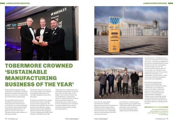 Responsible paving and walling manufacturer , Tobermore , has been named ‘ Sustainable Manufacturing Business of the Year ’ at the Business Eye Sustainability Awards 2023 .