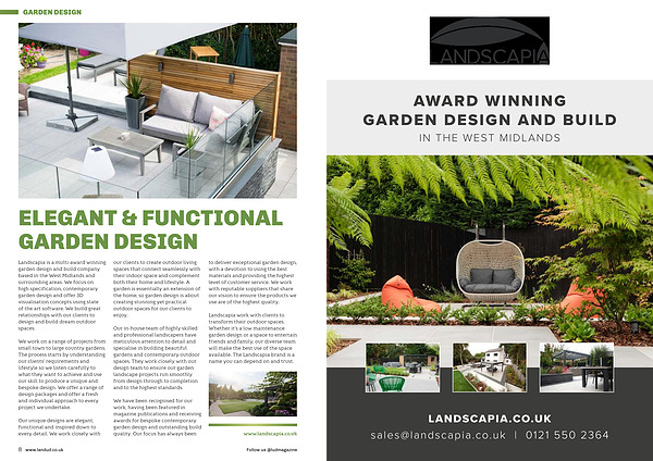 Landscapia is a multi-award winning garden design and build company based in the West Midlands and surrounding areas . We focus on high specification , contemporary garden design and offer 3D visualisation concepts using state of the art software . We build great relationships with our clients to design and build dream outdoor spaces .