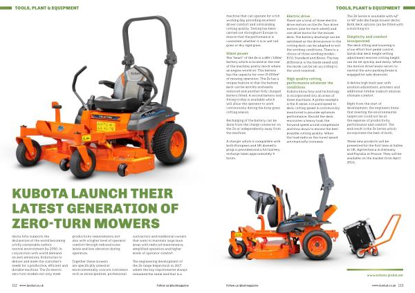 Silent power The “ heart ” of the Ze is a 48V / 10kW battery which is located at the rear of the machine , pretty much where an engine would sit . This battery has the capacity for over 15 000m ² of mowing operation . The Ze has a unique feature in that the battery pack can be quickly and easily removed and another fully charged battery fitted . A second battery and fitting trolley is available which will allow the operator to work continuously during the busy grass cutting season .