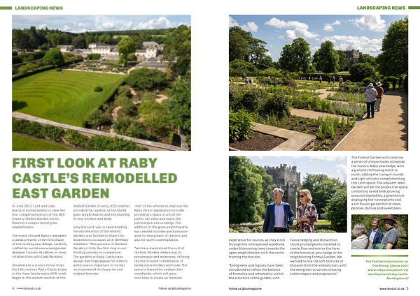 The Formal Garden will comprise a series of unique mazes alongside the historic Raby yew hedge , with a graceful rill flowing north to south , adding the tranquil sounds and sight of water complementing this calm space . The adjacent West Garden will be the productive space , combining raised beds growing seasonal vegetables , a greenhouse displaying hot house plants and a cut flower garden full of roses , peonies , dahlias and sweet peas . experience for visitors , as they stroll through the interspersed woodland under blossoming trees towards the open amphitheatre , with the castle framing the horizon .