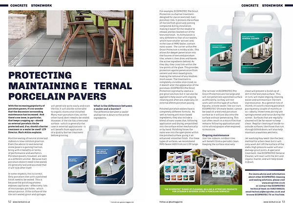 For example , ECOPROTEC Pre Grout Protection is a barrier treatment designed for use on textured , matt porcelain tiles . It protects the surface of the tile from grout and jointing compound during installation , making it easier for the residue to release and be cleaned out of the textured finish . Its formulation is very different to that of our sealers , which have smaller ‘ actives ’ and , in the case of MPG Sealer , contain nano waxes . The carrier within Pre Grout Protection is mildly acidic . This allows for deeper penetration into the fissures of textured porcelain tiles , where it then dries and leaves the active ingredients behind . As they dry , they cross link within the low points of the glaze . This provides protection against penetration from cement and resin-based grouts , making the removal of any residues much easier . The treatment is completely invisible once cured , so it doesn ’ t alter the appearance of the porcelain . ECOPROTEC Pre Grout Protection is primarily used as a pre-grout solution , but it can also be applied to help assist with ongoing cleaning and aftercare , especially on external 20mm porcelain paving .