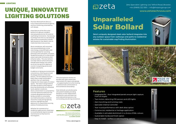 Zeta ’ s uniquely designed sleek solar bollard integrates into any outdoor space from walkways and paths to residential estates for sustainable wayfinding illumination .