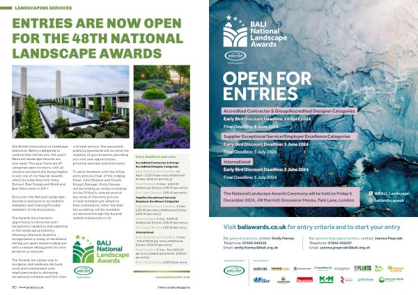 The British Association of Landscape Industries ( BALI ) is delighted to confirm that entries into this year ’ s National Landscape Awards are now open . This year there are 30 categories open for entry , with all winners automatically being eligible to win one of our Special Awards , which includes Best First Time Entrant , Best Design and Build and Best Newcomer to BALI .