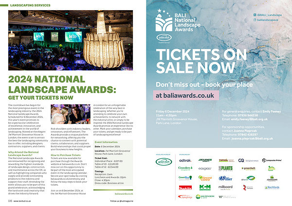 Join us on 6 December 2024 , at the JW Marriott Grosvenor House in London for an unforgettable celebration of the very best in landscaping . Whether you ’ re attending to celebrate your own achievements , to network with the industry ’ s elite , or simply to be inspired , the 2024 National Landscape Awards promise an experience like no other . Mark your calendars , purchase your tickets , and get ready to be part of landscaping excellence !