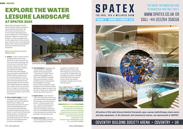 Tapping into the magic of water leisure , SPATEX 2025 is Informative , interesting and unmissable . The UK ’ s annual exhibition returns to the Coventry Building Society Arena , Tuesday 4th to Thursday 6th February . Whether commercial or domestic , it offers an opportunity to take a deep dive into the world of spas , wellness suites , swimming pools , steam rooms , saunas , water features , enclosures and all the ancillary equipment .