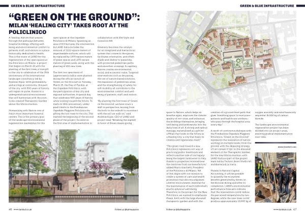 GREEN & BLUE INFRASTRUCTURE space to Nature, which helps us breathe again, improves the climate quality of our cities, and enhances the buildings themselves, bringing well-being and biodiversity into the daily lives of all. A strong and radical message, materialized as a gift for a Milan that looks to the future as a Healing City: a city that heals its citizens and regenerates itself.”