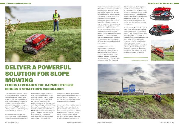 : Turf equipment provider, Ferris, is working with Briggs & Stratton’ s commercial brand Vanguard to power its new FRC7 slope mower, designed to tackle the toughest of mowing conditions. Paired with Vanguard’ s state of the art engine, the innovative FRC7 redefines what’ s possible when tackling steep hills and difficult terrains.