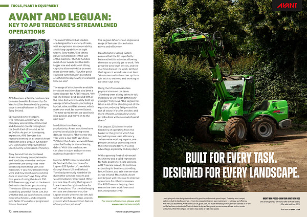Specialising in tree surgery, tree removals, and surveys, the company serves both commercial and domestic clients throughout the South East of Ireland, as far as Dublin. As part of its ongoing expansion, APB Treecare has recently invested in a range of Avant machines and a Leguan 225 Spider Lift, significantly improving their speed, safety, and overall efficiency.