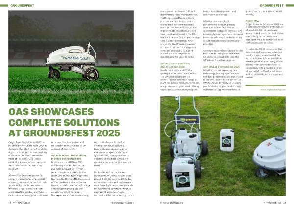 Origin Amenity Solutions( OAS) is returning to GroundsFest in 2025 to showcase the latest in turf solutions, digital technology and line marking innovation. After two successful years at the event, OAS will be exhibiting both outdoors on stand RB140 and indoors in Hall 2 on stand 20.