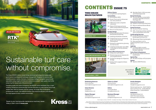 Every effort is made to ensure the accuracy and reliability of material published in Landscape & Urban Design however, the publishers accept no responsibility for the claims or opinions made by advertisers, manufactures or contributors. No part of this publication may be reproduced or transmitted in any form or by any means, mechanical, electronic( including photocopying) or stored in any information retrieval system without the prior consent of the publisher.