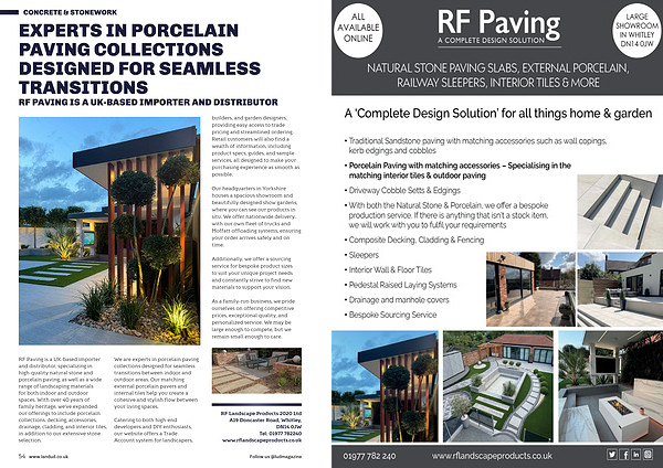 RF Paving is a UK-based importer and distributor, specializing in high-quality natural stone and porcelain paving, as well as a wide range of landscaping materials for both indoor and outdoor spaces. With over 40 years of family heritage, we’ ve expanded our offerings to include porcelain collections, decking, accessories, drainage, cladding, and interior tiles, in addition to our extensive stone selection.