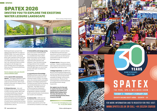 Nothing enlivens a project like adding water! Discover its magic at SPATEX 2026. From water features, saunas, steam rooms, swimming pools, spas, wellness suites, hot tubs, ice baths and enclosures – the UK’ s only dedicated water leisure expo has it all, and more! Free to attend, and open to all, the expo runs from Tuesday 3rd to Thursday 5th February at the Coventry Building Society Arena.