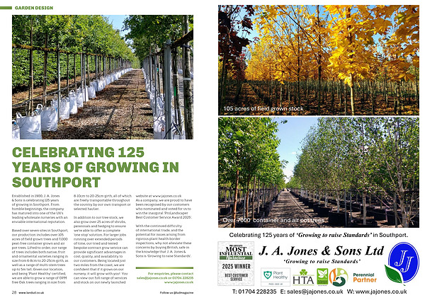 In addition to our tree stock, we also grow over 25 acres of shrubs, perennials and hedging to ensure we’ re able to offer a complete‘ one stop’ solution. For larger jobs running over extended periods of time, our tried and tested bespoke contract grow service can provide significant advantages in cost, quality, and availability to our customers. Being located just two miles from the coast, we are confident that if it grows on our nursery, it will grow with you! You can view our full range of services and stock on our newly launched website at www. jajones. co. uk As a company, we are proud to have been recognised by our customers who nominated and voted for us to win the inaugural‘ ProLandscaper Best Customer Service Award 2025’.