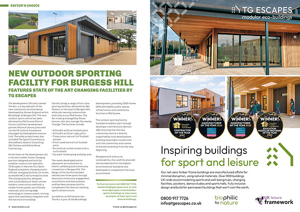 The development officially named The Arc, is a key element of the new community facilities being developed by Homes England within Brookleigh at Burgess Hill. The new outdoor sports centre has been delivered by Mid Sussex District Council and their development partner Alliance Leisure, procured via the UK Leisure Framework( managed by Denbighshire Leisure Ltd). The wider project team also included The Sports Consultancy, AtkinsRealis, Hadron Consulting, S & C Slatters and White Horse Contracting.