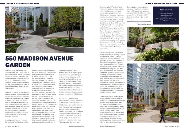The 41-story, 850,000-square-foot 550 Madison began as a single-tenant headquarters for AT & T when it opened in 1984. The building’ s new garden is part of a six-year effort by Olayan to reimagine the high-rise – New York City’ s youngest historic landmark – with wellness initiatives, sustainability programs, and more than 30,000 square feet of luxury amenities. In addition to the garden, building improvements include a Rockwell Group-designed clublevel amenity space that promotes collaboration and creativity, including a concierge overseeing the Grand Hall, the Library, the Hearth Room, the Screening Room, and the Pool Room. The club level also includes multiple dining offerings and kitchens for events.