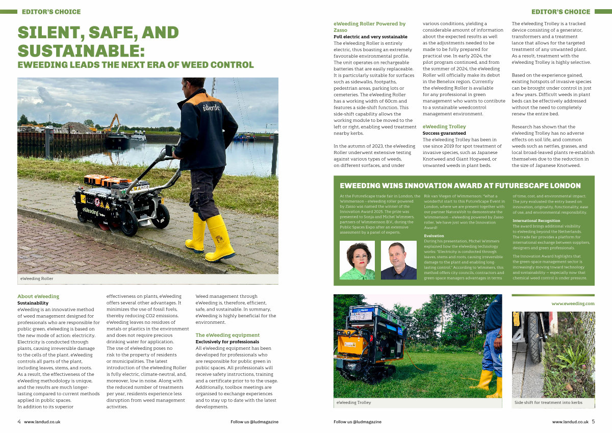 At the FutureScape trade fair in London, the Wimmersson – eWeeding roller powered by Zasso was named the winner of the Innovation Award 2025. The prize was presented to Sonja and Michel Wimmers, partners of Wimmersson B. V., during the Public Spaces Expo after an extensive assessment by a panel of experts.
