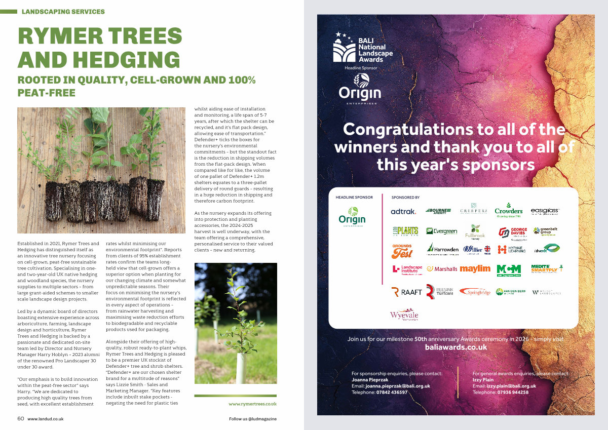 Established in 2021, Rymer Trees and Hedging has distinguished itself as an innovative tree nursery focusing on cell-grown, peat-free sustainable tree cultivation. Specialising in oneand two-year-old UK native hedging and woodland species, the nursery supplies to multiple sectors – from large grant-aided schemes to smaller scale landscape design projects.