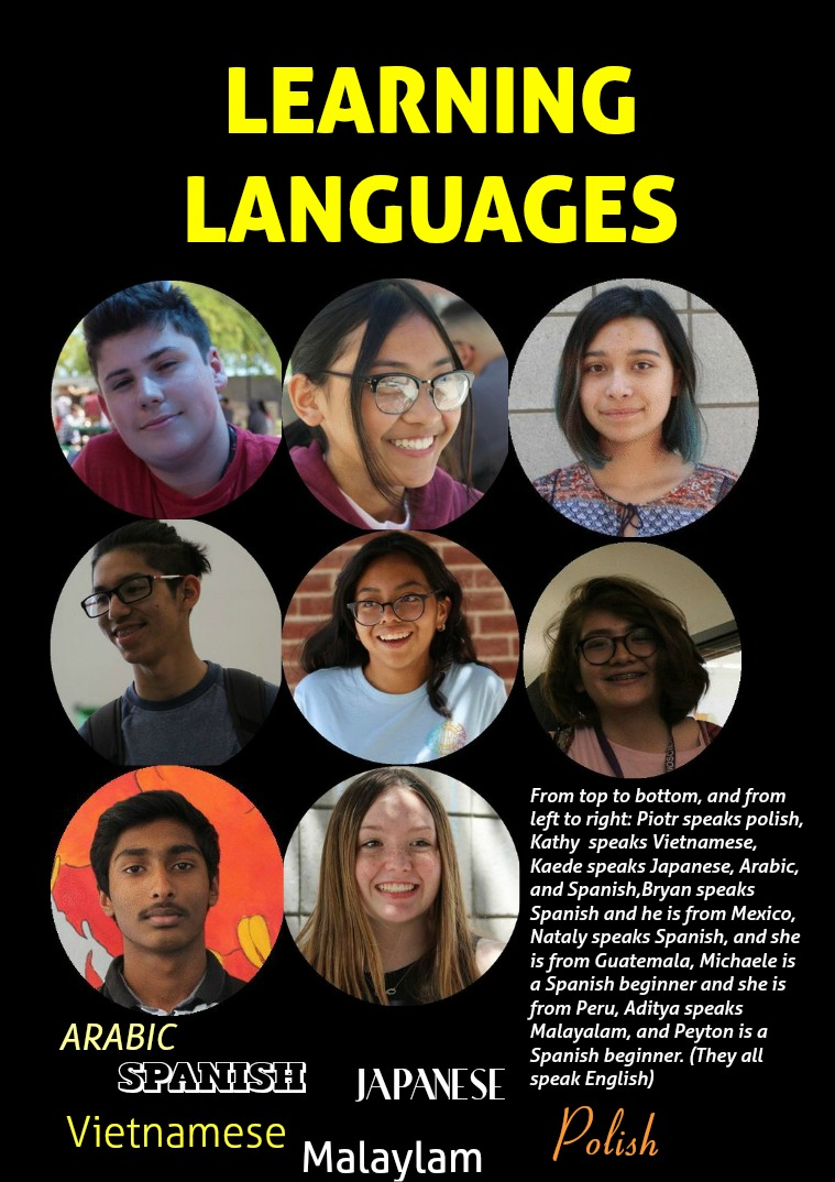 From top to bottom, and from left to right: Piotr speaks polish, Kathy speaks Vietnamese, Kaede speaks Japanese, Arabic, and Spanish,Bryan speaks Spanish and he is from Mexico, Nataly speaks Spanish, and she is from Guatemala, Michaele is a Spanish beginner and she is from Peru, Aditya speaks Malayalam, and Peyton is a Spanish beginner. (They all speak English)