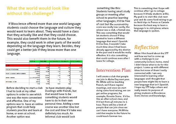 something like this: Students having small study groups or meeting after school to practice learning other languages, it’d be free of cost but the sustainability score was really low. Lastly, the winner was a club, a formal one. This was something that would let students choose if they wanted to learn a different language that wasn’t Spanish. It’d be free, it wouldn’t take much time since it had been already approved by the district in the past and it would be really effective. It is also something that could continue even after I leave for college.