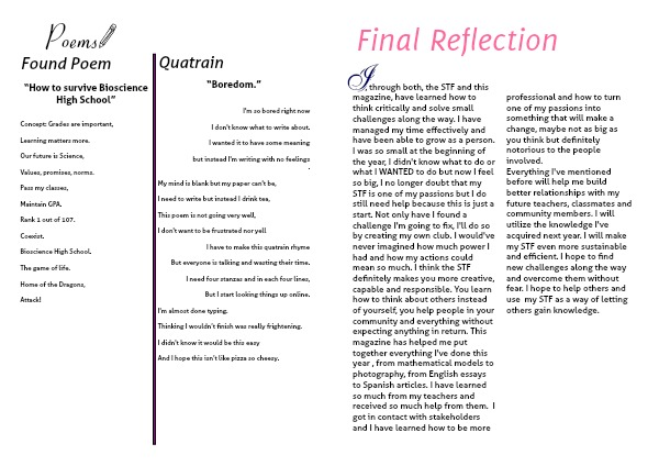 , through both, the STF and this magazine, have learned how to think critically and solve small challenges along the way. I have managed my time effectively and have been able to grow as a person. I was so small at the beginning of the year, I didn't know what to do or what I WANTED to do but now I feel so big, I no longer doubt that my STF is one of my passions but I do still need help because this is just a start. Not only have I found a challenge I'm going to fix, I'll do so by creating my own club. I would've never imagined how much power I had and how my actions could mean so much. I think the STF definitely makes you more creative, capable and responsible. You learn how to think about others instead of yourself, you help people in your community and everything without expecting anything in return. This magazine has helped me put together everything I've done this year , from mathematical models to photography, from English essays to Spanish articles. I have learned so much from my teachers and received so much help from them. I got in contact with stakeholders and I have learned how to be more